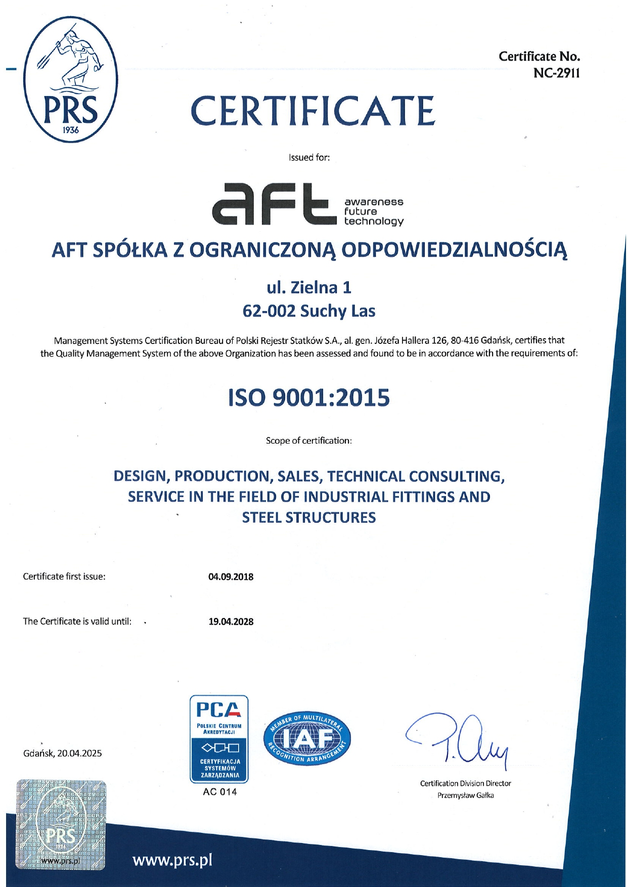 Mamy wdrożone normy ISO9001 oraz ISO3834-2, EN 1090-1.